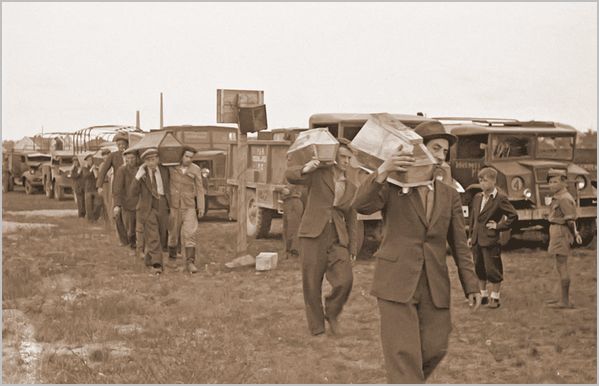 Ocaleni z Pogromu oczekują na transport z Kielc.